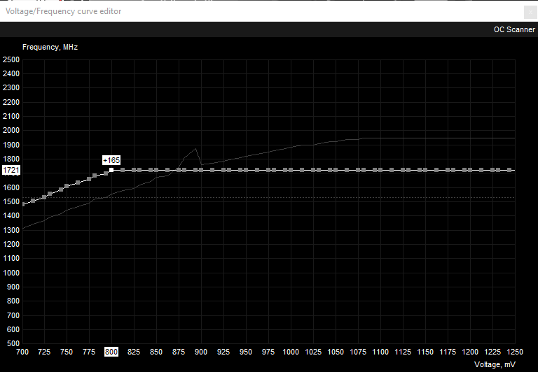 I decided to double down on undervolting and see just how far we can take this. I repeated all the steps we’ve taken but with a target frequency set to the GPU’s boost clock (1721MHz). Fast forward an hour later and this is the resulting voltage / frequency curve I ended with.