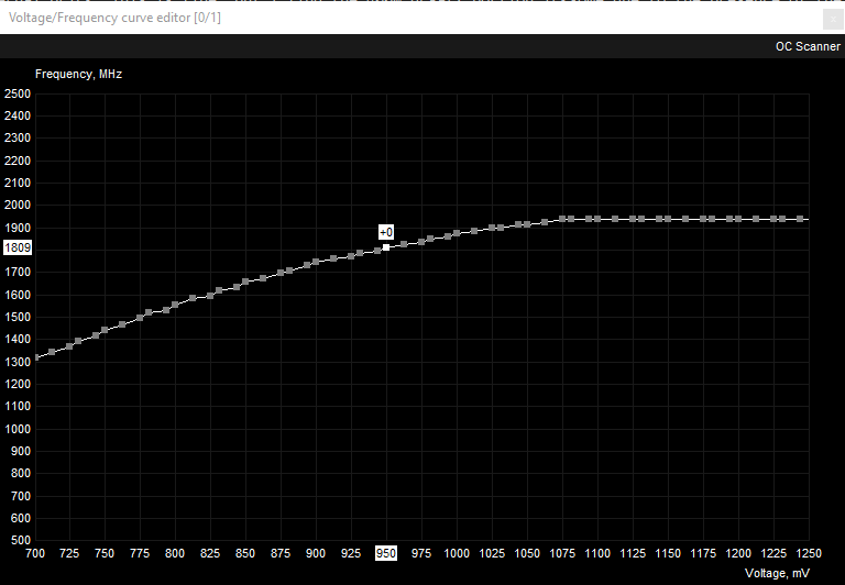 Ctrl + F to bring up the voltage frequency curve. Find our target voltage of 950mv and take note of the frequency (1809mhz in the screenshot)