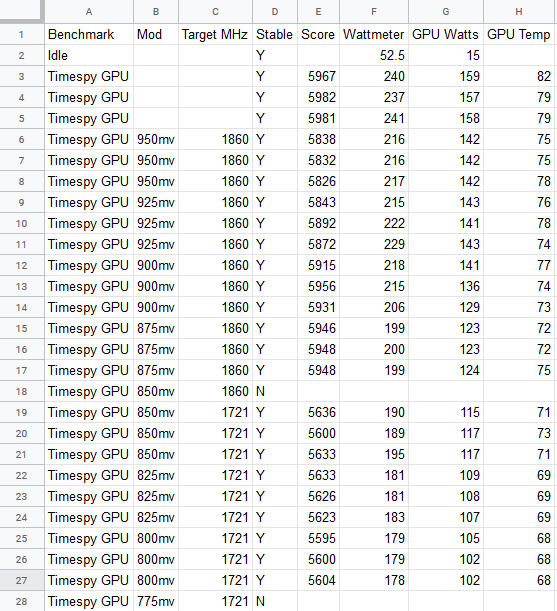 I chose my target frequency to be 1860mhz – 139mhz over boost and 26mhz under max, as during benchmarking the gpu clock was pinned at 1860mhz most the time (this is where HWiNFO average readings can come in handy!). The exact number doesn’t matter, as one can adjust their target frequency depending on their undervolting results. I change my target frequency later on. We’ll also choose our starting voltage to be 950mv, which is a pretty middling undervolt, and we’ll work our way down.
