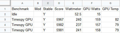 - Record score, max wattmeter reading, max watts / temp from the gpu
