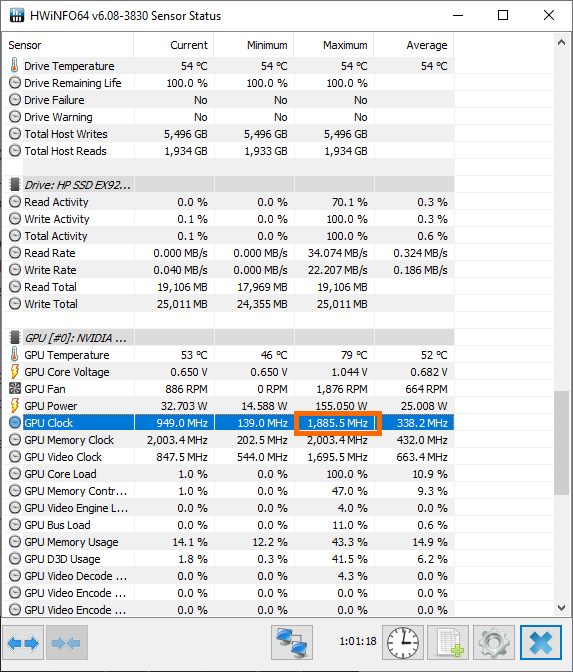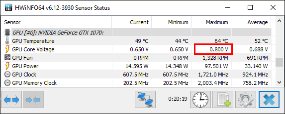 First, determine what target frequency you’d like your GPU to boost to, ideally a number between the GPU’s boost clock and max clock. The GPU’s boost clock will be listed in the manufacturer’s specification and also in GPU-Z. The GPU’s max clock is determined at runtime through GPU boost and will be reported as the “GPU Clock” in HWiNFO64 (make sure it’s running while the benchmark are in progress). Below are screenshots from HWiNFO64 and GPU-Z showing the differences between these two numbers.