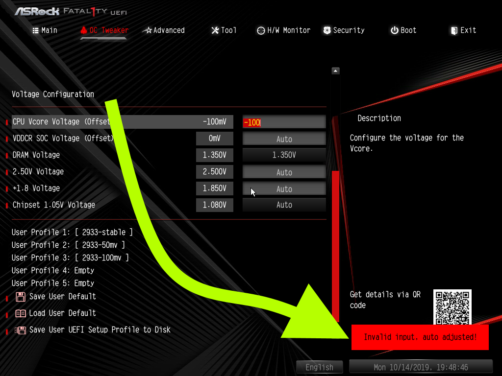 While I normally recommend setting the value in increments of 10mv, the BIOS can be finicky sometimes. I was only able to get “-50mv” and “-100mv” to stick, any other values would cause it to be reset to “Auto” or display an error if -100 was exceeded.