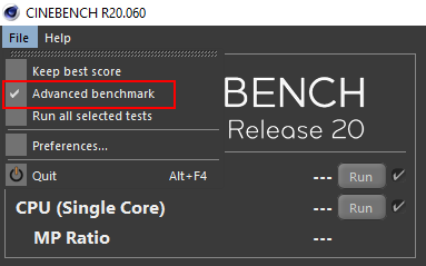 Then benchmark the cpu with Cinebench. We’ll need to first configure Cinebench to show the single core benchmark like so: