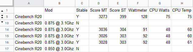 I wish I could say more about how the undervolted scores compare to other CPUs at stock especially the 2700E. The best I can do is take a list of unofficial scores coupled with smattering of official scores and say that in the multi-threaded benchmark, we land around the 2600X mark while handily beating the i7-7700K (both 95W TDP). The single thread score is about equal to i7-4850HQ’s, a 4C/8T mobile processor with a 47W TDP.