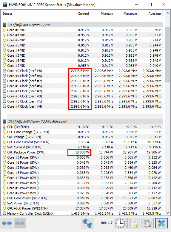 An interesting note, while running the underclock, HWiNFO seemed to report bizarre numbers. Even at idle, it was reporting core clocks to be at their max of 3GHz. Initially, I thought that this meant the system wasn’t idling, but HWiNFO power usage reported values that contradicted this thought. Power usage was at idle, but clocks were at 3GHz.